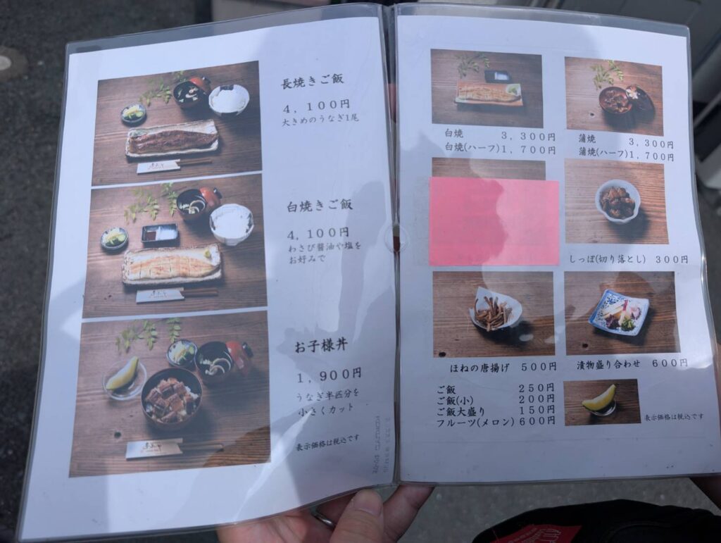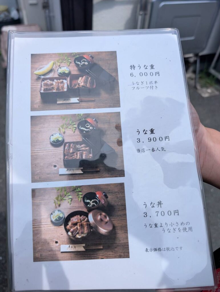 今回は1番人気のうな重(3900円)2つ、白焼ハーフ(1700円)1つ、しっぽ(300円)1つを注文しました。
