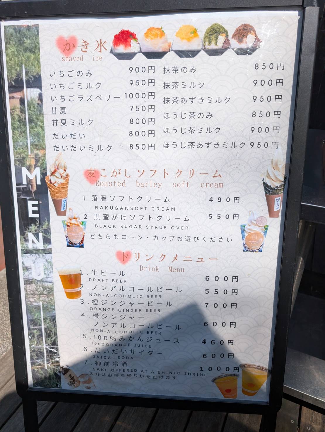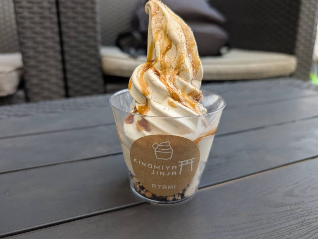 鳥居のそばにある可愛らしいカフェ。帰りがけにオープンしているのを見かけ、ついつい立ち寄りました。私たちはお目当ての「麦こがしソフトクリーム」を注文しましたが、大きなかき氷を注文しているお客さんも多かったです。麦こがしは、大麦を炒って粉にした香ばしい粉のことです。香りはきな粉に似ていますが、より香ばしくて素朴な甘みが特徴。来宮神社の「麦こがしソフトクリーム」は、その粉を練り込んで作られていて、口に入れると麦の香ばしさがふんわり広がります。濃厚だけど後味はすっきりで、参拝後のひと休みにぴったりの名物スイーツです。