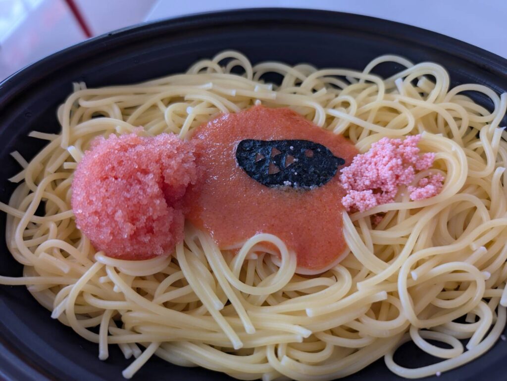 当然空席はなく、並んでいるうちに少しでも空くことを期待して列に加わりました。悩み抜いて注文したのは「こだわり3種の明太パスタ」「ジャンボおにぎり(できたて明太子、うなぎ明太)」です。