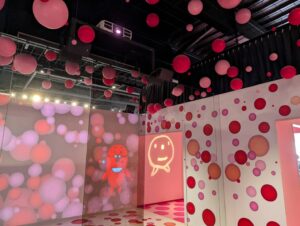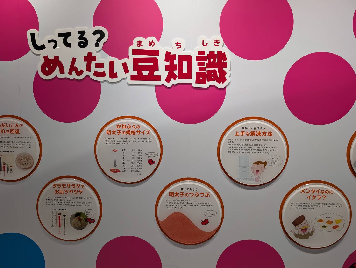 こちらは遊びながら明太子の秘密を学ぶことができるエリアで、ピンクのつぶつぶが可愛らしいフォトスポットや間違い探し・神経衰弱などが楽しめるゲームコーナー、明太子ができるまでの工程をアニメで説明してくれるシアターコーナーなどがあります。